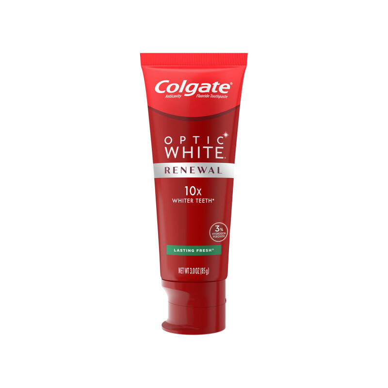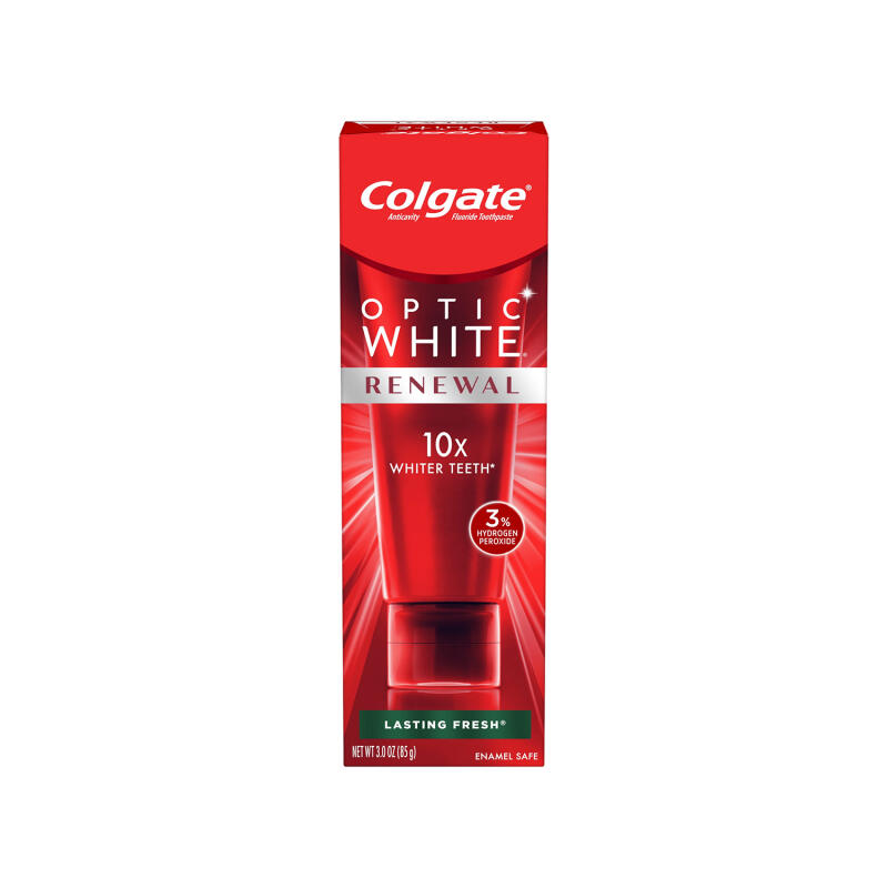 You'll receive one 3 oz. tube of Colgate Optic White Renewal Toothpaste, a Teeth Whitening Toothpaste featuring a patented 3% hydrogen peroxide formula for deep whitening beyond surface stains. Enjoy 10X whiter teeth compared to a fluoride toothpaste without hydrogen peroxide, following 4 weeks of directed use. Optic White Renewal, a hydrogen peroxide toothpaste, goes beyond surface stain removal to deeply whiten teeth while maintaining enamel safety for daily use. This mint toothpaste with a refreshing flavor is also an anticavity fluoride toothpaste, guarding against cavities. Colgate Optic White toothpaste is vegan, gluten-free, and sugar-free for comprehensive oral care.